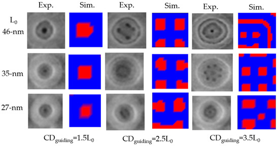 Comparison of the simulation results (Sim.) using rectangular guiding patterns to the experimental results (Exp.) using cylindrical guiding patterns from Reference [49] for the resulting morphologies obtained after the directed self-assembly (DSA) of cylindrical PS-b-PMMA block copolymers (BCPs). is a natural period of the block copolymer (BCP), which is directly correlated to the molecular weight of the block copolymer (BCP).
