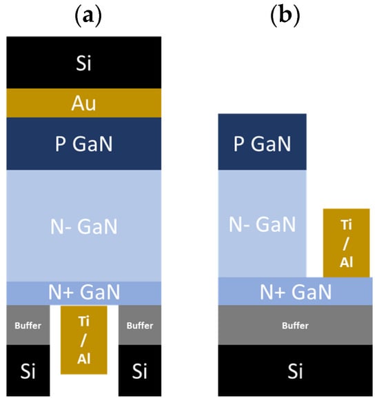 - An additional sample, referred to as sample A, was prepared with a pseudo-vertical structure. This configuration involved contacting the n+ layer from the front side on the Ga-face after ICP mesa etching (Figure 2b) to compare the Ti/Al ohmic contact quality with the N-face from the same GaN layer.