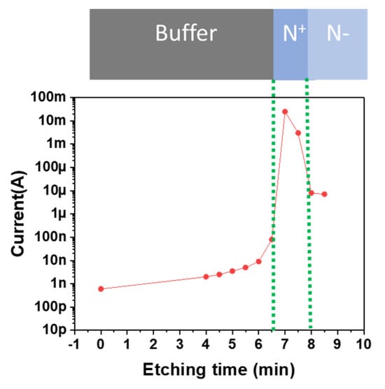 To avoid robustness issues of the membranes, the vertical GaN fabrication process started with the bonding of the front side on a Silicon substrate by thermal compression of gold at 300 °C (Figure 2a). The metal used for bonding was Ti (100 nm)/Au (200 nm), deposited by evaporation on both the Silicon substrate and the PIN diode frontside. The backside process began with thinning the Si substrate from 1 mm down to 150 µm, followed by the deposition and patterning of a thick resist layer using standard lithography. This resist layer served as a mask during the local removal of Si using deep reactive-ion etching. The buffer layer was subsequently removed using a Cl2 ICP (inductively coupled plasma)-based recipe. Due to the membrane’s critical etching depth, etching control is not trivial. Therefore, the etching time was calibrated by monitoring the electrical conductivity. Direct I(V) measurements on the surface (without metals) at 30 V resulted in the following current level for each layer: nA range for the buffer layers, mA range for the n+ layer, and µA range for the n- layer (Figure 3).