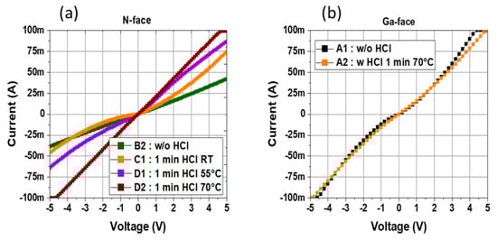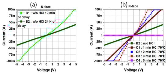 Figure 5a shows TLM measurements on the N-face for a 10 min delay between the buffer etching and the deposition of metal (sample B1). The IV characteristics reveal a poor linear behavior, although a rather high current of 100 mA at 4.5 V is observed resulting in 2.4 × 10−4 Ω·cm2-specific contact resistance. When increasing the delay to 24 h (sample B2), the measured current drops to 40 mA at 5 V due to much higher specific contact resistance >10−3 Ω·cm2. These results suggest that an oxidation phenomenon occurs during the delay time. An HCl (37%)-based wet treatment was developed with a temperature initially fixed at 70 °C in agreement with reported results in [30] demonstrating the need for high temperatures to efficiently remove the native oxide.