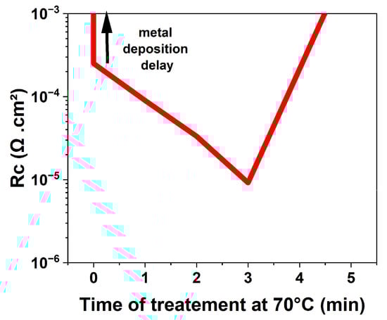Figure 5b shows the time dependence of the HCl wet treatment at 70 °C on the ohmic-specific contact resistance. Up to 3 min time duration (samples C1, C2, and C3), the HCl treatment significantly reduces the specific contact resistance down to 9 × 10−6 Ω·cm2 without additional annealing (see Figure 6), making this approach fully compatible with any frontside post-process. On the other hand, when further increasing the treatment time up to 5 min and above (sample C4), the quality of the ohmic contacts severely deteriorates, and the extracted current drops dramatically, indicating a surface degradation due to prolonged treatment.