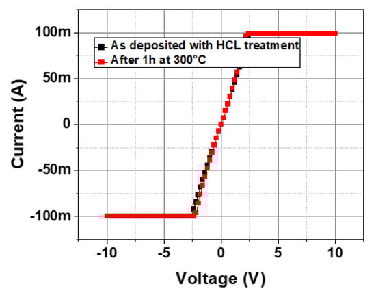 An additional test was performed in order to gain some initial insights into the thermal stability of the ohmic contacts. Sample C3 (using the optimum conditions of 3 min HCl treatment at 70 °C) was introduced in an oven in a rich N2 environment at 300 °C for 1 h. Figure 7 shows the electrical current–voltage TLM measurements before and after 1 h thermal stress at 300 °C. The identical IV curves clearly indicate that the ohmic contacts are stable with no short-term impact of the temperature on the applied wet pretreatment.