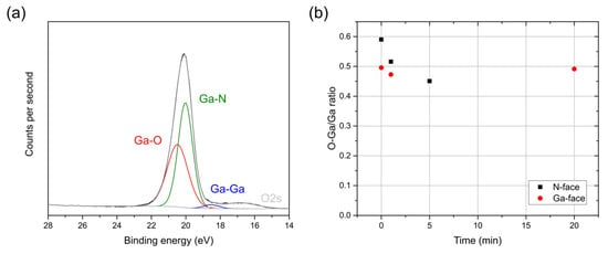 To observe the chemical modification of the GaN surface with the HCl treatment, various N-face and Ga-face samples were treated with HCl at 70 °C for time durations ranging between 1 and 20 min and immediately measured by XPS. The oxidation state of the surface can be determined by deconvoluting the Ga3d spectra into three peaks: Ga-N, Ga-O, and Ga-Ga at a binding energy of 20.0–20.1 eV, 20.5–21.0 eV, and 18.5–19.1 eV, respectively [26,27,29]. As an example, the deconvolution of the Ga3d spectrum of the 5 min HCl-treated N-face sample can be found in Figure 8a. Using these fits, the O-Ga-to-Ga ratio is then calculated and plotted as a function of HCl treatment time at 70 °C in Figure 8b. The data show that the untreated N-face is oxidized to a greater extent than the untreated Ga-face. In addition, the HCl treatment is observed to reduce the N-face upon treatment time, while even after a treatment time of 20 min, the Ga-face remains roughly unaffected. These findings correspond well to the electrical results, showing no impact of the HCl treatment on the Ga-face, while an initial increase in contact quality is found upon removal of the Ga-O surface species for the N-face. The latter is also in agreement with the literature, reporting that the removal of native oxide from the GaN surface is crucial to obtaining low-resistance ohmic contacts [19,31].