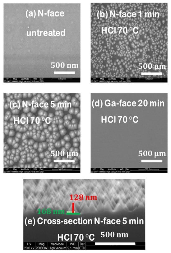SEM images display that the HCl treatment not only reduces the N-face but can also be associated with the formation of hexagonal pyramid-shaped features at the surface, as displayed in Figure 9. While the Ga-face again remains unaffected even after the 20 min HCl treatment at 70 °C (Figure 9d), the features are observed to enlarge upon treatment time for the N-face (Figure 9a–c). After the 5 min HCl treatment, the height and width of the features are estimated to be approximately 128 nm and 166 nm, respectively (Figure 9e). Similarly, [32] report the formation of sixfold nanopyramids on N-face GaN after etching for 45 min in 2 M KOH at 90 °C, whereas the Ga-face is observed to remain smooth. Their observations demonstrate that the hexagonal pyramid shape originates from the preferential etching of crystalline planes. Also, [33,34] report the formation of pyramid shapes that are observed to increase over time after etching in heated KOH or H3PO4 solutions.