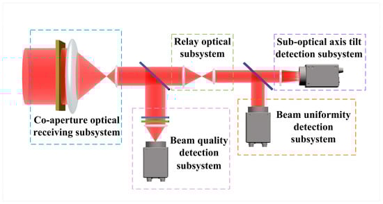 The overall system included a co-aperture optical receiving subsystem, a relay optical subsystem, a suboptical axis tilt detection subsystem, a beam uniformity detection subsystem, and a beam quality detection subsystem. By employing spectral division technology, the light received by the co-aperture optical receiving subsystem was distributed among the various subsystems. This not only enabled large-aperture reception but also made the structure more compact and the volume smaller. During the design process, the components adhered to the following basic principles to ensure the accuracy and rationality of the system design: (1) the co-aperture optical receiving subsystem and relay optical subsystem must satisfy the optical pupil alignment principle; (2) the co-aperture optical receiving subsystem and beam quality detection subsystem must be compatible; and (3) the relay optical subsystem, beam uniformity detection subsystem, and suboptical axis tilt detection subsystem must meet the optical pupil alignment principle. The schematic diagram of the overall system layout is shown in Figure 1.