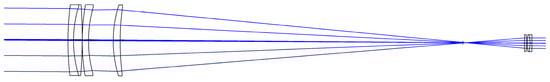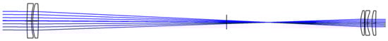 In the formulas, represents the visual magnification of the telescope system, the distance from the object point to the lens group is , the distance from the image point to the lens group is , and the focal length of the lens group is . All optical surfaces in this Keplerian initial configuration were strictly coaxial. As multiple operating wavelengths need to be accommodated, chromatic aberration correction became a critical factor in improving the system’s beam quality. To eliminate chromatic aberration, the objective lens group of the co-aperture optical receiving subsystem used a combination of positive and negative lenses. The combination of flint glass and crown glass effectively compensated for chromatic aberration. By establishing an evaluation function and changing the optical glass materials, spherical aberration and chromatic aberration could be further corrected. The doublet structure could further eliminate chromatic aberration. Therefore, both the objective and eyepiece groups used single lenses combined with a doublet structure. This design not only effectively compensated for chromatic aberration but also reduced the angle of incidence by adjusting the beam height, thereby reasonably controlling and minimizing the system’s spherical aberration.