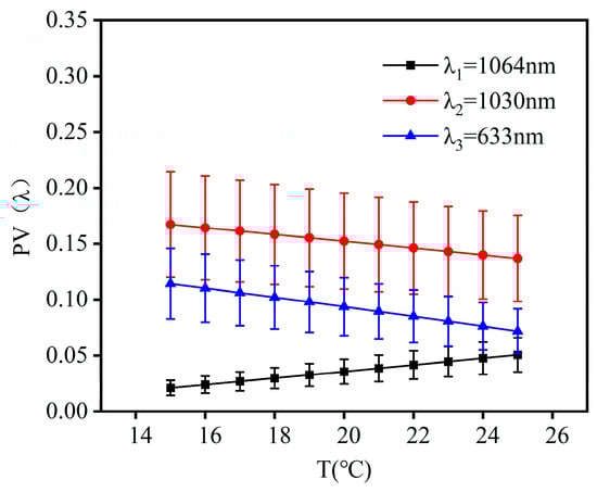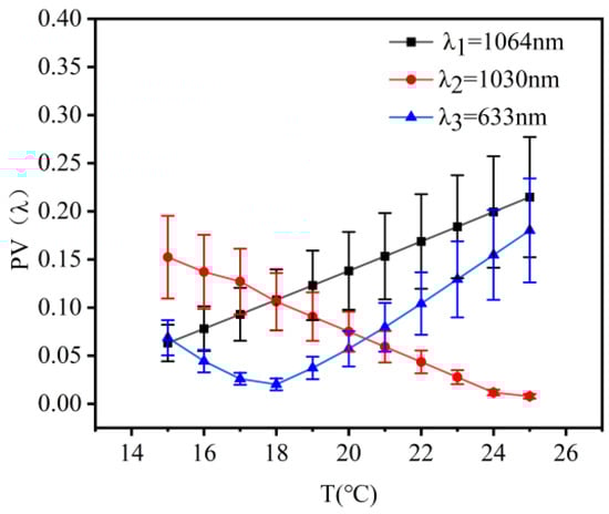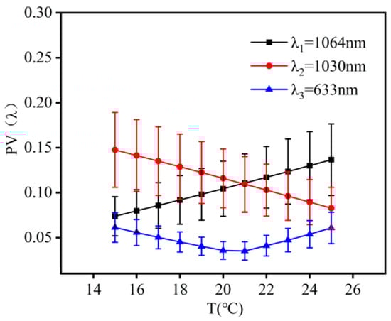 The variation in beam quality for λ1, λ2, and λ3 wavelength lasers within the temperature range of 15 °C to 25 °C is shown in Figure 5. When the encircled energy was 83.6%, the variations in the beam quality factor β were 0.04, 0.06, and 0.16 times the diffraction limit. The results showed that the changes in the values of PV, RMS, and beam quality factor were not significant with temperature variation. This indicated that the system exhibited good imaging quality.