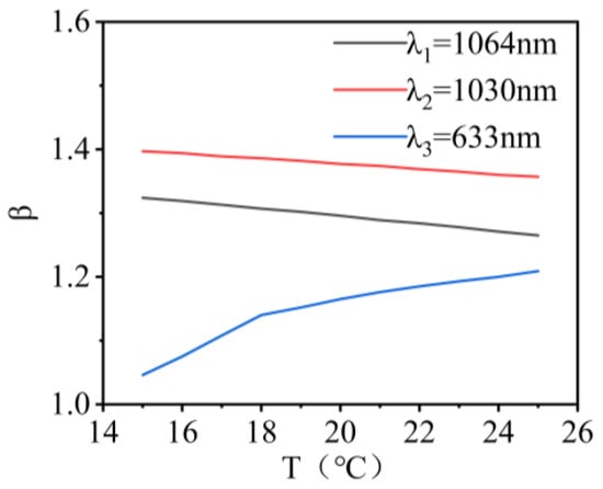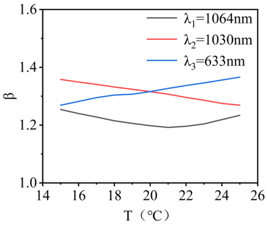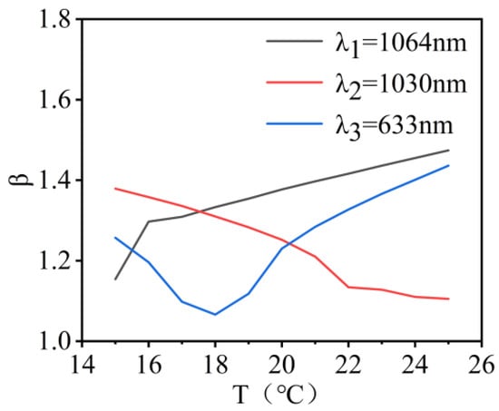 The variation in beam quality for λ1, λ2, and λ3 wavelength lasers within the temperature range of 15 °C to 25 °C is shown in Figure 8. When the encircled energy was 83.6%, the variations in the beam quality factor β were 0.062, 0.097, and 0.089 times the diffraction limit. This indicated that the system exhibited good imaging quality.