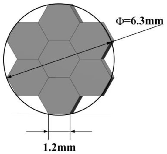 The suboptical axis tilt detection subsystem of the coherent synthetic beam was aligned with the relay optical subsystem according to the principle of pupil matching, and the sensitivity of wavefront aberration and beam quality to temperature was consistent with that of the relay optical subsystem. Both the co-aperture optical receiving subsystem and the relay optical subsystem employed a collimator system, which compressed the beam size while establishing a conjugate relationship between the adjustment plane and the microlens segmentation of the suboptical axis tilt detection subsystem, based on the principle of conjugate imaging. A microlens array of the suboptical axis tilt detection subsystem was placed at the exit pupil of the relay optical subsystem. The subaperture parameters of the microlenses are shown in Figure 9: the edge length of the subaperture was 1.2 mm; the focal length was 100 mm; and the seven beams were arranged in a hexagonal pattern, matching the optical system’s pupil and fitting the size of the subbeam axis detector. The simulated effect of the beam after passing through the microlens array is shown in Figure 10, where the beam remained arranged in a hexagonal pattern with a pixel size of 9 μm × 9 μm, and a single beam spot contained 91 pixels. At this time, the system’s combined focal length was 1501.2 mm, which met the design requirement of a combined focal length greater than 1000 mm.