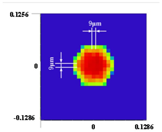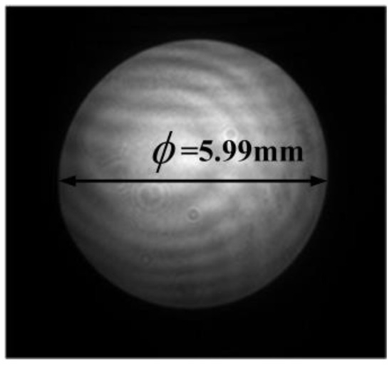 By detecting the phase tilt of the beam, we adjusted the incident light and examined the uniformity and quality of the corrected beam [20,21]. The image received by the beam uniformity detection camera is shown in Figure 20, with 666 pixels covering the spot image, meeting the technical requirement of covering at least 600 pixels. Using the formula