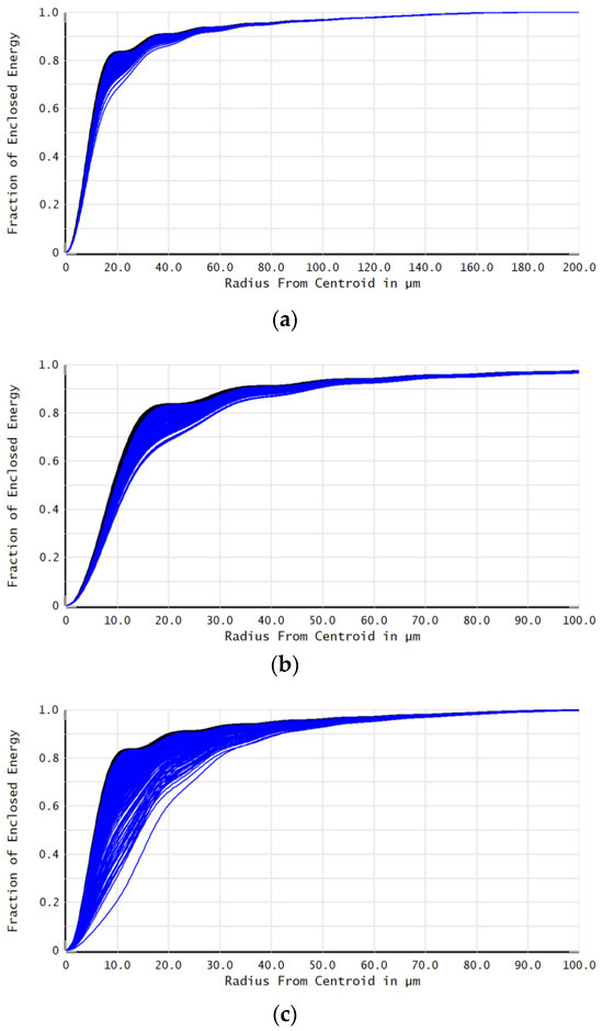 The tolerance parameters for the co-aperture optical receiving subsystem, relay optical subsystem, and suboptical axis tilt detection subsystem were set as follows: aperture of 3, thickness of ±0.05 mm, decenter X/Y of 0.03 mm, tilt X/Y of 0.025, refractive index of 0.001, and Abbe number of 0.3%. Using the Monte Carlo method, 300 computational analyses were conducted on lasers in the λ1, λ2, and λ3 bands at temperatures ranging from 15 °C to 25 °C, investigating the impacts of factors such as eccentricity and tilt on the imaging quality of the optical system. The results are presented in Figure 11: when the encircled energy was 83.6%, the beam quality β of the combined system was 1.26 times the diffraction limit in 90% of cases, satisfying the technical requirement of <1.4. At this point, it could be considered that the system’s imaging quality reached an ideal state.