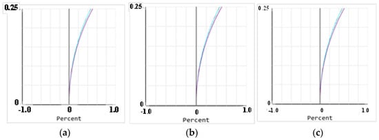 The beam uniformity detection subsystem was located at the exit pupil position of the relay optical subsystem and shared the optical path with the coherent composite beam suboptical axis tilt detection subsystem. Therefore, the wavefront aberration and the influence of temperature on the beam quality of this module were the same as those of the tilt detection subsystem and will not be repeated. When the distortion was less than 1%, the optical system could be considered to perform well. A further image quality analysis of the beam uniformity detection subsystem was conducted, and the distortion curves at 15 °C, 20 °C, and 25 °C are shown in Figure 12, with distortions of 0.4717%, 0.4720%, and 0.4277%, all of which met the requirement of distortion being less than 1%. At this point, the output spot size was 5.995 mm, which was smaller than the camera target area, allowing coverage of 667 pixels in the selected camera, thereby meeting the technical specification requirement of ≥600 pixels.
