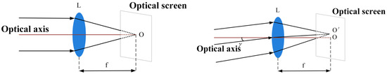 Monochromatic light propagating along the optical axis, after passing perpendicularly through a convex lens, resulted in an Airy spot observed in the lens’s focal plane [19]. The center of the Airy spot was located at the intersection of the optical axis and the focal plane, with point O designated as the reference point for the beam direction at 0 μrad. When the beam exhibited wavefront distortion, the center of the Airy spot shifted. By detecting the positional shift of the light spot, the inclination of the beam could be inferred, which constituted the beam inclination detection method based on far-field light spots. The specific calibration principle is illustrated in Figure 15.