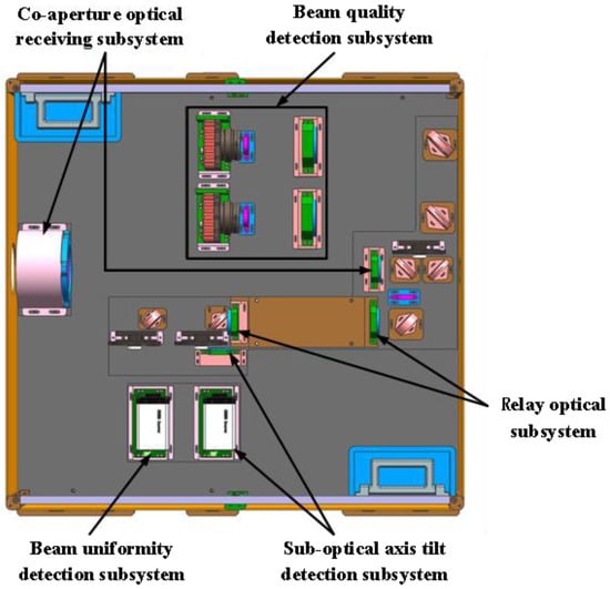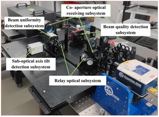 Figure 2 is the structural diagram of the measurement system. It consisted of the co-aperture optical receiving subsystem, the relay optical subsystem, the suboptical axis tilt detection subsystem, the beam uniformity detection subsystem, and the beam quality detection subsystem.