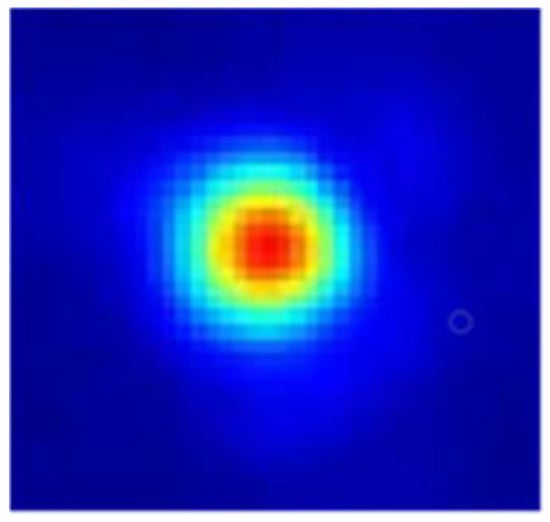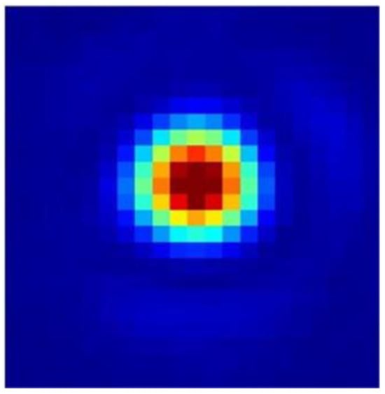 Figure 18 presents the suboptical axis spot image detected by the camera. In this study, the squared weighted centroid algorithm was chosen to process the images collected from the target surface. This algorithm used the square of the pixel intensity as the weight, which allowed for an accurate calculation of the centroid position, even if the spot shape did not closely resemble a Gaussian distribution. The camera’s pixel size was 9 μm × 9 μm, with a resolution of 1600 × 1100 pixels. Based on the atmospheric coherence length, the RMS wavefront variation for a 1 rad offset within the subregion was calculated, and the optical axis detection accuracy was determined using the equation