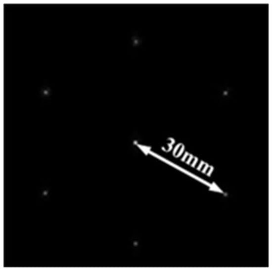 The seven paths of the 30 mm diameter laser were compressed, split, and redirected to illuminate an array composed of seven hexagonal microlenses. This array was positioned at the exit pupil of the secondary compression, establishing an image–object conjugate relationship. The combined spots of the seven detected subpaths are shown in Figure 19.