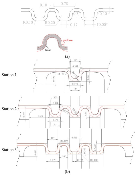 (a) Final geometry of the micro-channels to be manufactured by micro-roll forming (units in mm) (b) Forming roll geometry of preform-stations 1 and 2 and sizing station 3 (units: mm), the sheet profile at each station is outlined in red.