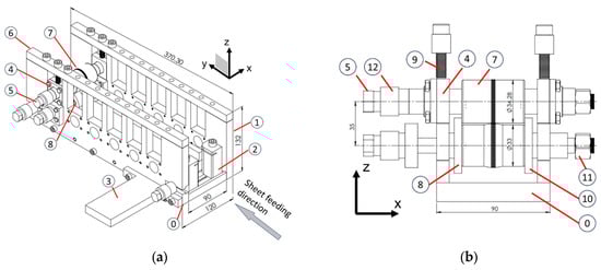 (a) Schematic of the high-precision micro-roll former with (b) the last station installed. Dimensions are not to scale (units: mm). Circled numbers indicate the following parts: 0—base, 1—side plate, 2—feeder station, 3—motor/handle drive location, 4—bottom/top bearing housing, 5—shaft, 6—top block, 7—top roll, 8—bottom roll, 9—gap adjusting screws, 10—locking spacers, 11—locking nut, and 12—pulleys to connect the timing belt.