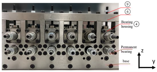 Photograph of the left side of the high-precision micro-roll former, showing the permanent bearings which are used to position the bottom roll shafts. The circled numbers are in accordance with Figure 2.