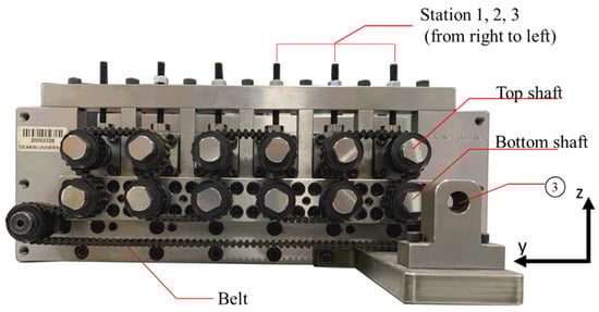 Photograph of the right side of the high-precision micro-roll former, showing how the timing belt connects the bottom and top roll shafts (view from the opposite side compared to Figure 3).