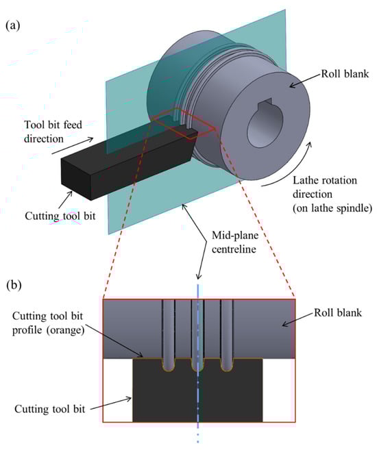 (a) Schematic of the roll turning process to achieve the desired corrugation profile, and (b) a detailed view, showing the cutting tool bit profile. Schematics not to scale.