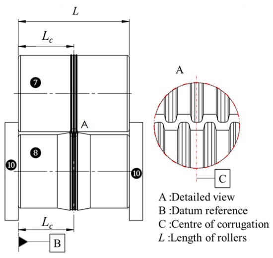 As described in Section 2.2, the special roll former hardware design enables a vertical and horizontal roll tool alignment in each and between individual stations that is theoretically within 0.005 mm. Due to this design, the tool position in the roll former and the alignment between the top and bottom rolls (Figure 6) depend on the dimensional accuracy of the top and bottom rolls. Ideal alignment means that the centerline of the top roll corrugation coincides with the centerline of the bottom corrugation (as shown by centerline C in Figure 6). For this, the distance Lc from the corrugation centerline to the left reference plane (Datum B in Figure 6) must be 0.005 mm, for both the top and bottom rolls. From the point of manufacturing, it is easier to achieve high precision for the total width of the cylindrical roll rather than to ensure a tight tolerance for the horizontal position of the center corrugation over the width of the roll.
