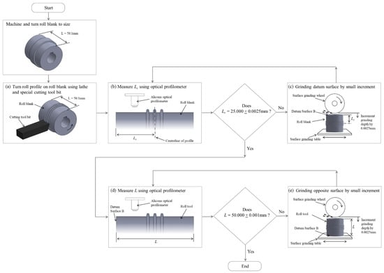 A high precision center positioning of the metal sheet in the roll former was achieved with three approaches: (I) At the start of forming, the sheet was feed into the first forming station with a guide station (② in Figure 2). (II) The minimum length of the precut sheet was more than 6-times (300 mm) the station distance (47 mm); this ensured that when the center length of the strip was formed the sheet was guided by all roll stations. (III) The special procedure for high-precision roll alignment (Section 2.4) ensured that the center corrugation of the strip was aligned and followed a straight line through the roll former. To achieve the required high precision for (III), a special procedure was applied, which is summarized by the flowchart in Figure 7. First, all rolls were pre-cut from a cylindrical rod with an initial length L = 50.1 mm, which is 0.1 mm longer than the required roll width. These pre-cut roll blanks were then turned on a lathe (Figure 7a), using the procedure described in Section 2.3. After turning, an optical profilometer (Alicona InfiniteFocus G5, Raaba, Austria) was used to measure the distance Lc of the corrugation center to the datum surface B (Figure 7b). A surface grinding machine was then used to grind down the critical roll surface B in multiple steps (Figure 7c). For this, the roll was positioned vertically with an electromagnetic fixture, and a precision grinding wheel was used to achieve a fine surface finish. Between each of the surface grinding steps, additional optical profilometry measurements were performed to measure . Using this procedure, a tolerance of 0.0025 mm was achieved for the corrugation center position distance to the left reference plane (Datum B) for both the top and the bottom roll. Subsequently, the opposite roll surfaces were ground (Figure 7d) to achieve the total width L 2 50.000 0.003 mm (Figure 6) for both the top and the bottom roll. With the center corrugation of both the top and the bottom rolls now aligned within 0.0025 mm to the left reference plane, and the top roll position in relation to the bottom roll being fixed with locking spacers (⑩ in Figure 6), the overall horizontal tool alignment is within 0.005 mm.