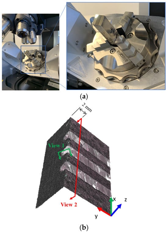 The tool bit was mounted on the specimen stage at a 45° inclined angle (see Figure 8a). Using the Alicona InfiniteFocus measurement suite (v5.3.2), two section-views (Figure 8b) were constructed to measure the tool bit before and after it was used for cutting the rollers. View-1 was aligned with the center of the male profile of the tool bit parallel to the y–z plane (Figure 8b) while View-2 was parallel to the x–z plane and 2 mm offset from the corner edge of the tool bit. The Section Results presents the results regarding the three tool bit conditions before and after cutting.