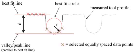 3D surface profile scanning of the roll tools was also conducted with the Alicona, using the same settings as used for scanning the tool bits. The measurement focused on the 2D cross-section profile with four equally spaced measurements performed over the 360° circumference. The profiles were then analyzed in the Alicona InfiniteFocus measurement software to determine the valley depth, , and radii, of the manufactured roll tool profiles (Figure 9). The measured radii and depths were then compared to the designed (ideal) profile shape of Figure 1b. To measure the radius, five equally spaced points along the measured radius were selected and a circle of best fit was measured. For the flat (straight line) regions of the profile, again five equally spaced points were selected, and a line of best fit was generated. These lines were then used for the measurement of the valley depth, , as shown in Figure 9. Finally, the shape error of the radii and the depths of the produced tool shape (Figure 1b) when compared to the designed roll tool profile were determined.