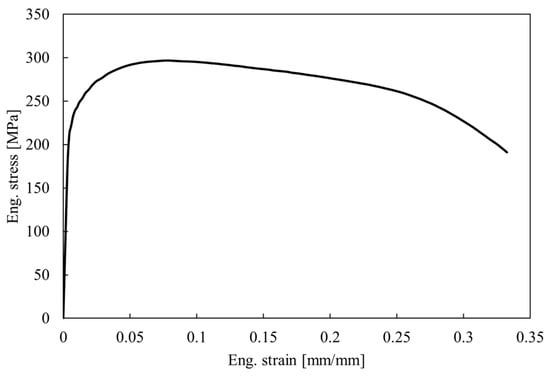 The material used for the roll forming test was a commercial pure titanium (CP-Ti, grade 2) of 0.1 mm thickness (supplier: Ti-Shop, London, UK). Titanium sample sheets of 50 mm (W) × 300 mm (L) were produced with a guillotine and tensile test specimens [26] cut transverse to the rolling direction with wire-EDM cutting. A typical tensile test curve is shown in Figure 10 and the average yield and tensile strength were 226 MPa and 297 MPa, respectively.