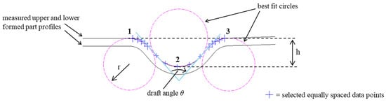 The draft angle θ, shown in Figure 11, gives a measure for springback with a higher forming depth resulting in a smaller draft angle indicating less springback. In the formed sheet, the angle is measured by best fitting the side wall of the section cut with straight lines in AutoCAD. For this, the cross-section images of the sheet formed in station 1 and station 2 were analyzed to identify the upper and the lower sheet surface profiles. Using these profiles, the method for quantifying the tool geometry presented in Section 2.5 was applied to determine the geometry of the formed parts. For this, the circles that provide the best fit to the top and bottom radii of the formed part were created, and then the tangential lines of these circles were used to identify the side wall of the parts (Figure 11). The angle between the tangential lines for the neighboring sidewalls was considered to be the draft angle θ. This fitting method applies only to stations 1 and 2. For station 3, the formed sheet profile had a short and nearly vertical sidewall which did not allow achieving a good fit with circles to identify tangential lines. This prevented the identification of the sidewalls and the analysis of the draft angle θ for this condition. For station 3, therefore, only the profile height (depth) h was determined as the distance between the bottommost node of the bottom circle (location 2) to the line that connects the topmost points of the top circles at location 1 and location 3, see Figure 11.