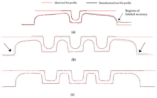 Tool bit profile cross section measured with an Alicona profilometer. The desired profile is indicated in red while the measured profile is shown in black. (a) Roll station 1. (b) Roll station 2. (c) Roll station 3.