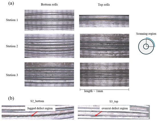 Roll profile geometry analysis. (a) Good regions for top and bottom rolls of stations 1–3. (b) Defect regions observed in the bottom and the top roll of station 2 and 3, respectively.