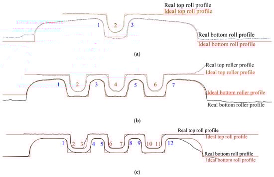 Comparison between the ideal and the measured micro-roll tool profiles: (a) Station 1. (b) Station 2. (c) Station 3.