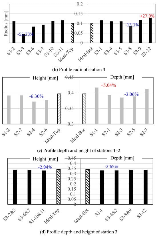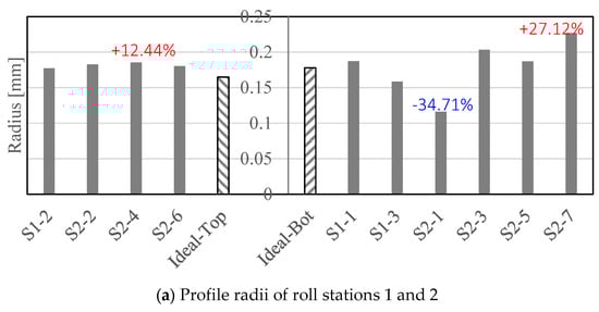 The measured tool profile radii are compared to the ideal (designed) radii in Figure 15 where the dimensions of the top rolls of stations 1 and 2 are shown on the left of Figure 15a and for the bottom rolls on the right. The ideal profile radius of S2-1 and S2-7 is 0.178 mm. However, the manufactured S2-1 radius was approximately 34% lower while for S2-7 it was 27% higher compared to the ideal profile radius. A significant overcut of 55% can be observed in S3-3 (Figure 15b) of the top roll which conforms to the visual observation of overcutting reported in Figure 13b.