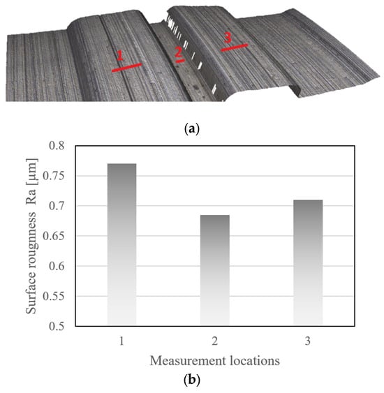 The surface roughness Ra of the roll tools was measured with the Alicona profilometer on the bottom roller of station 1; this is representative for the surface quality achieved with the cutting procedure for all micro-rollers. The surface roughness was analyzed in the three locations shown in Figure 16a) over a 10 µm line width and path lengths of 0.5 mm in locations 1 and 3, and of 0.25 mm in location 2. The Ra values shown in Figure 16b are close to those observed in previous work [13].