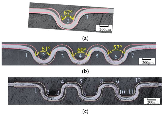 Cross-section after micro-roll forming. The profiles in orange represent the ideal shape. The draft angle is annotated in yellow, and the locations of the radius measurement are marked with white numbers. (a) 2D sheet profile after roll station 1. (b) 2D sheet profile after roll station 2. (c) 2D sheet profile after roll station 3.