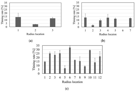 Material thinning was measured using the pixel method [17]. The thinning at the radius location was measured in three proximity locations, and the averaged values are shown (in percentage) in Figure 18. Stations 1 and 2 show a maximum thinning of 14.25% and 13.31%, respectively, while there is significantly higher thinning in station 3, with the maximum thinning of 32.5% found in radius 6 which is positioned in the center of the middle groove.