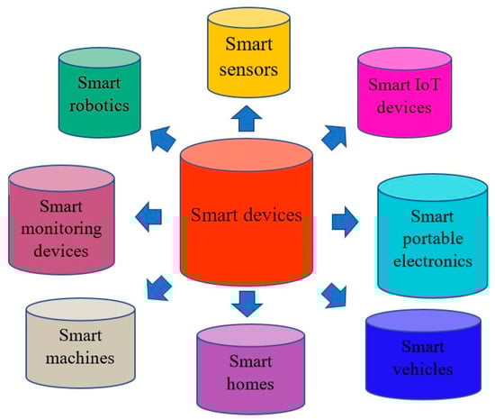 Smart devices are electronic devices that possess the special characteristics of context-awareness, the ability to interconnect with other equipment in the operating system, and autonomous computation. Figure 11 shows smart devices integrated into IoT systems such as smart homes, smart factories, smart machines, smart vehicles, and smart healthcare devices [114]. Smart devices are low in cost, flexible, smart, stable, and highly accurate and can be used in real time [115]. Smart devices are now utilized in many fields of practical applications such as in additive manufacturing [116], smart grids [117], remote laboratory control [118], personal protection devices for women [119], smart homes to make people more comfortable [120], and in the management of human diabetes [121]. In the interconnecting environment, smart devices can connect to other electronic components through IoT gadgets, share electronic data, process autonomous duties related to signals and data, communicate effectively with electronic cells, and improve the quality of system performance. Some practical applications of TENGs have attracted research groups such as using smart devices to improve the positioning precision of global navigation satellite systems [122], monitoring heartbeats through acoustic signals [123], introducing wearable aerogel into smart devices for controlling the temperature [124], integrating smart devices into sensor networks for monitoring the ecosystem via the IoT [125], and measuring noise exposure with high accuracy [126]. The proliferation of application-oriented smart devices has expanded the smart environment in which smart devices are proactive in communicating and processing data to perform smart tasks in a smart platform with integrated smart devices, internet connection, digital computing, and protocol interfaces.