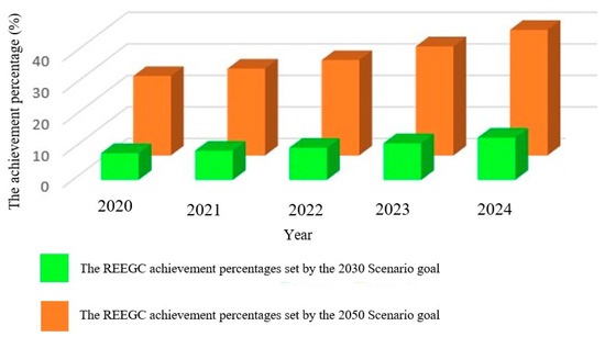 The percentages of REEGC achievements from 2020 to 2024 in comparison to the goals set by the 2030 and 2050 Scenarios for lowering global temperature of 1.5 °C.
