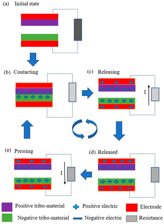 Figure 4 illustrates the working mechanism of the TENG during contact–separation mode. It includes four steps of cyclic contact and separation to create electricity. Figure 4a illustrates the initial position when no charges occur. Figure 4b illustrates the two tribo-surfaces that move into contact with each other to generate electricity. Figure 4c illustrates the separating state, which produces unbalanced potentials between the two triboelectric materials. The electric flow runs via the external load. Figure 4d illustrates the released position of the two triboelectric materials with a balanced state. Figure 4e illustrates the subsequent pushing state that generates unbalanced potentials between the two triboelectric materials. The current runs via the external load. The triboelectric nanogenerator creates electricity represented by open-circuit voltage (VOC), as demonstrated by Formula (1) [89]: