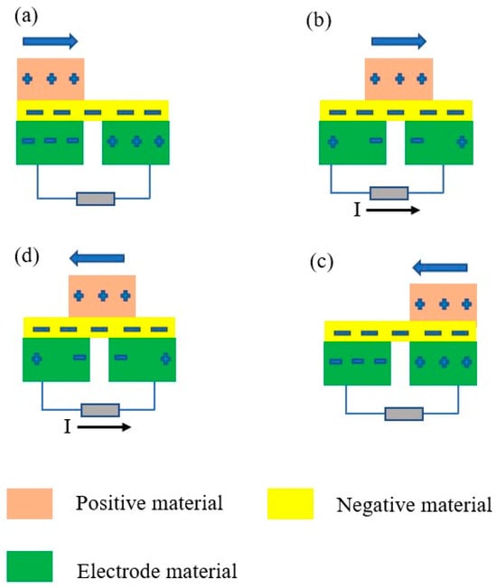 In sliding mode, the triboelectric nanogenerator undergoes four stages of sliding-in-contact between two triboelectric materials—positive and negative—to produce electricity. Figure 5 shows the sliding mode mechanism of the triboelectric nanogenerator. Figure 5a illustrates the initial stage where no charges occur. Figure 5b illustrates the two tribo-surfaces that slide into contact with each other to produce electricity. The electric flow runs via the external load. Figure 5c shows the delay state, which recovers the balanced potentials between the two triboelectric materials. Figure 5d illustrates the two tribo-surfaces that slide into contact again with each other to produce electricity. The current runs via the external load [90]. The open circuit voltage of the sliding TENG can be expressed by Equations (2)–(4) [91]: