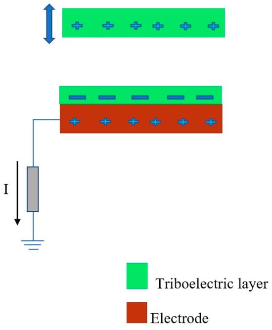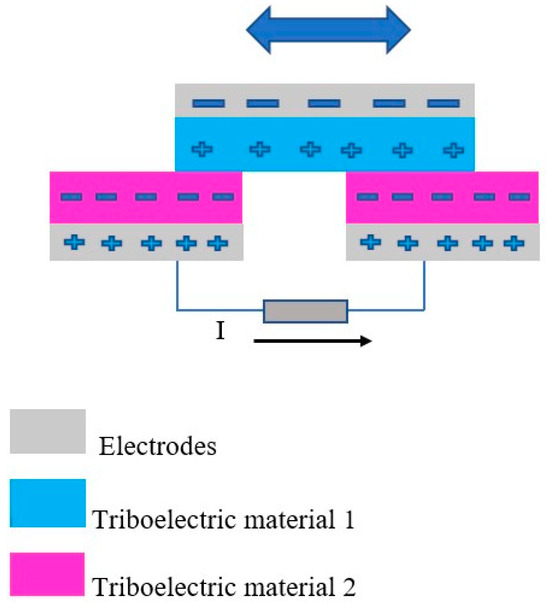 In free-standing mode, the triboelectric nanogenerator produces a current via an external load by acting of one dielectric layer on the two dielectric surfaces. The dielectric layer activates electrical particles moving between the two electrodes, resulting in a current running via an external load. Figure 6 shows the working principle of the free-standing-mode triboelectric nanogenerator when generating an electric current via an external load [92]. The basic governing equation for the output performance of the free-standing TENG can be briefly expressed by Equation (5) [93]:
