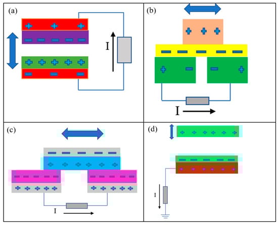 One of the biggest roles of the TENG is that it can be used in hybrid energy systems and power grids to boost the availability of energy for daily living [96]. Advanced TENGs can produce electricity using the four working principle modes shown in Figure 8: contact–separation mode, as shown in Figure 8a; sliding mode, as shown in Figure 8b; free-standing mode, as shown in Figure 8c; and single electrode mode, as shown in Figure 8d, respectively [97].