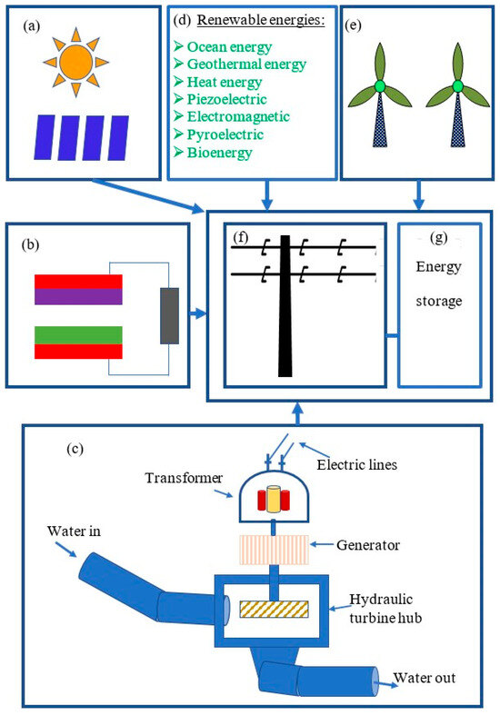 The proposed hybrid renewable energy system. (a) Solar energy; (b) triboelectric nanogenerator; (c) hydropower; (d) renewable energy harvesters of ocean energy, geothermal energy, heat energy, piezoelectric generators, electromagnetic generators, pyroelectric generators, and bioenergy; (e) wind power; (f) power grid; (g) energy storage.