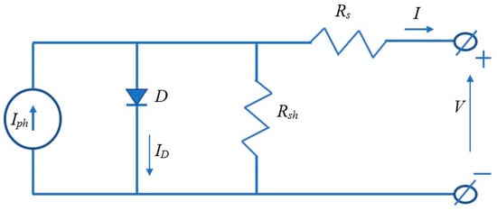 Solar energy is normally converted into electricity using a solar electricity energy converter. One example is a solar photovoltaic system, which is used to change solar energy to electrical energy under the photovoltaic effect of solar cells fabricated from semiconductors with junctions of p-n. Figure 10 shows the equivalent circuit that converts solar energy into electricity using a single solar cell. Solar cells produce power with an output current and output voltage as illustrated in Equation (7) [104]: