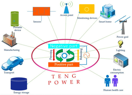 The proposed model that uses an advanced TENG for smart devices and emerging technologies such as energy storage, transportation, manufacturing systems, portable devices, smart sensors, self-powered sensors, access points, monitoring devices, smart homes, power grids, lighting applications, electric consumption devices, human healthcare, and smart agriculture production.