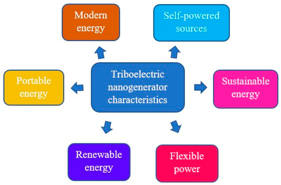 Through the triboelectric effect, TENGs convert mechanical energy into electricity using coupled triboelectric materials under contacting–separating cycles. TENGs have four working mechanism modes for producing electrical energy: contact–separation mode, sliding mode, free-standing mode, and single electrode mode. TENGs have recently emerged as an advanced energy harvesting technology that is modern, green, renewable, flexible, and endurable. High-performance TENGs, denoted as advanced triboelectric nanogenerators, have potential for use in many practical applications such as self-powered sources and portable electric devices, self-powered sensors, power grid penetration, manufacturing process monitoring, quality control, and medical and healthcare applications that meet the criteria of smart devices and emerging technologies. Advanced TENGs are highly efficient energy harvesters that can convert many types of wasted mechanical energies into the electric energy used in a range of practical applications such as smart devices, portable electric devices, smart sensors, smart manufacturing systems, and automatic actuators. Advanced TENGs feature many valuable characteristics of an energy source for smart devices and emerging technologies such as cost effectiveness, sustainable and renewable energy, green energy, light weight, flexibility, self-powered energy, and portable energy sources. Advanced TENGs are based on the triboelectric effect to harvest wasted mechanical energy and transform it into electricity [84]. Advanced TENGs feature outstanding characteristics of advanced sustainability [85], advanced flexibility [86], and blue energy [87]. TENGs generate electricity based on the triboelectric effect that occurs during the repeated contact and separation of two triboelectric materials. According to the triboelectric principle, one tribo-material provides electrical charge particles, while the other receives electrical charge particles [88]. Abundant tribo-materials are available in our environment that can be used for making triboelectric nanogenerators such as eco-materials, wood, metal, and polymers. The four basic operation modes of TENGs and hybrid renewable energy systems are described below.