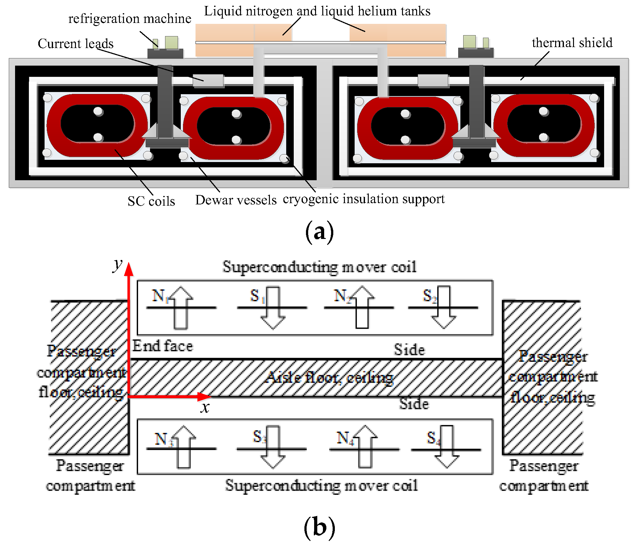 - Gong, T.; Ma, G.; Qian, H.; Liu, K.; Liu, K.; Wang, C.; Zhao, Z.; Zhao, Z. Electromagnetic investigation of a high-temperature superconducting linear synchronous motor for high-speed railway. IEEE Trans. Appl. Supercond. 2018, 28, 1–5. [Google Scholar] [CrossRef]