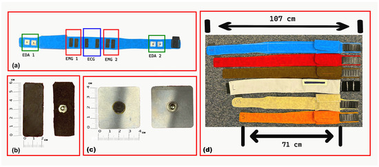 Overview of the developed wearable belt and electrode designs: (a) inside (skin-facing) view of the abdominal belt showing electrode locations for EDA, sEMG, and ECG; (b) custom-fabricated CB–PDMS electrodes with embedded copper mesh for sEMG and ECG acquisition; (c) CNC-fabricated stainless steel electrodes for abdominal EDA recording; and (d) available belt sizes from Small to XXXL in different colors.